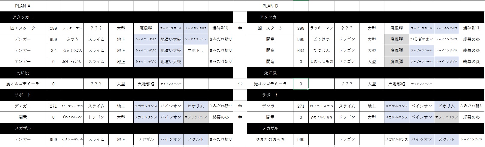 育成メンバーの選定についてアドバイスをお願いします。現在デンガー中心と闇竜中心の2パターンで迷っています。青塗の特技は伝授待ち(素材確保済み)でグレーは素材未確保です。異界と連盟が主でBSはあまり重視していません。特技の入れ替え含めアドバイスをお願いします。
