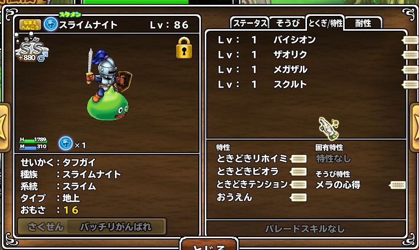 うちのはこんな感じ。SSだけどHPは1789(守護神化・タフガイ・レベル86)