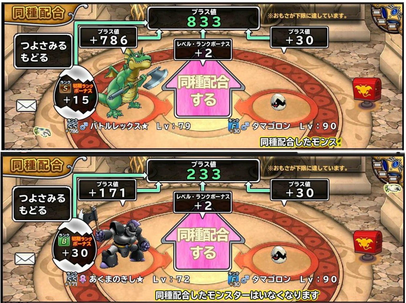 2枝です。こんな感じ。SSランクだけど素Bのあくまのきしには+100%、素Sのバトルレックスには+50%の+値が付きました。