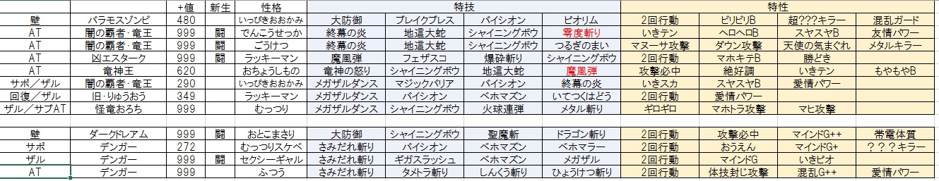 上枝でも質問させていただいたのですが、異界Lv8のクリアに向けてパーティーのアドバイスをお願いします。以下のメンバーが候補なのですが役割や特技についてアドバイスください。赤字特技は伝授予定(素材・超奥義確保済)です。上段の8体で挑むものの火力不足とつまみ事故でクリアできません。会心は薬漬けで対応しようと思います。ATを1枚はずしてサポ追加しようとも思うのですが誰を外すべきか思案しています。