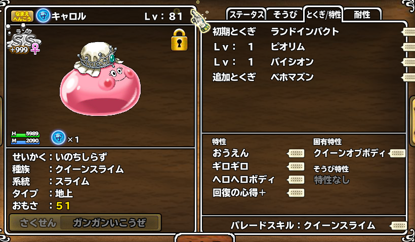 クイーンスライム育てています(^^♪タフガイタマゴGETしたら、大防御付ける予定です(^^♪