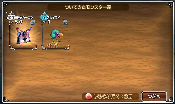 肉2ヶ×4回で、破壊神とハーゴンゴン来ましたぁ~^^ 来週にしようと思ってたけど、虫の知らせで(ガマンしきれず・・・)、今週投げてよかったです♪ ハーゴン、うれしい。 シドー、うちに今、青も含めて6匹たむろってる・・・ (^^; 前に質問でシドーは異界8のアタッカーはダメよダメダメって云われたので萎えてますw