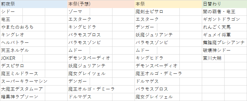 先日強敵予想の画像を投稿したものです。ゾーマ以外は全員当たりました(ついでに本祭の並びは予想と違って公式水準にしました)が日替わり実装…水曜…