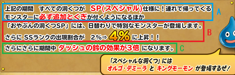 画像&color(Red){B枠};内にて「おやぶんの洞くつSP」と記載されている。モンパレ運営は日本語が疎いのか第三者に読ませる文章を作る能力が低いのか読む人間を混乱させたいのか知りませんが、&color(Blue){A枠};は全体を指し、&color(Red){B枠};では一部を指し、&color(Green){C枠};では再び全体を指すという難解(笑)な表現手法。運営「わはは!また引っ掛かりおったな!」って感じでしょうか。