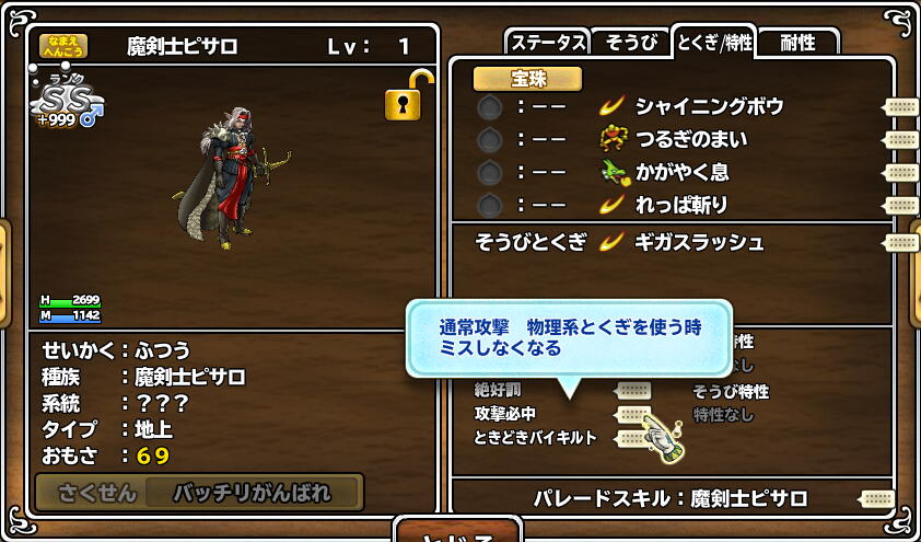 やったーー!我がパレード初の+999になったピサロ、攻撃必中きたー! (^-^