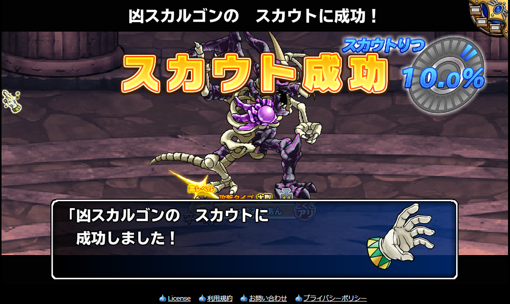開拓島は超奥義の目標は達成したので、久しぶりに迷宮潜っていたら、一発でスカウトできた。うちには異界サポのなまけもの凶スカがいるので、SS紋章使って配合してやろうかな (^-^