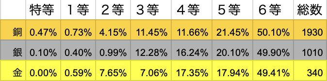 昨年末の魔王強敵から一年間の福引の結果。肉はほぼ確率通り。超奥義は1割多いくらい。金福の特等は結局引けず