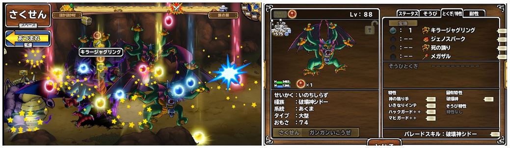 念願の神の踊り手+キラージャグリング完成しました (^_- かいたくで3日目以後を迷宮についやし、そのせいで(苦笑)馬を取り損ねたけど後悔しておりませぬ。 今回の異界8では必中フェザスコのモンスと協力して、うまく敵の動きを止めてくれました。 ホントは強敵産のデビルズソウルも覚えさせてあげたいところだけど、まだ他のモンス(連続攻撃なし)のSS×SS(S)配合を残しているからしばらくはおあずけです~。 キラージャグリングのグラは、他の特技にはない唯一無二のもので、見るたびにテンションあがります。 まだの方、あと少し時間ありますし、獲れることをいのっております (^_-