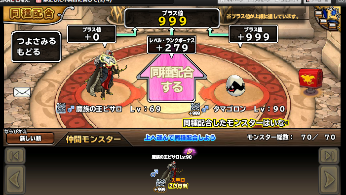 ストーリークリアしましたので、999タマゴを貰い、早速、今回の探検SPで来た魔族の王ピサロと配合。