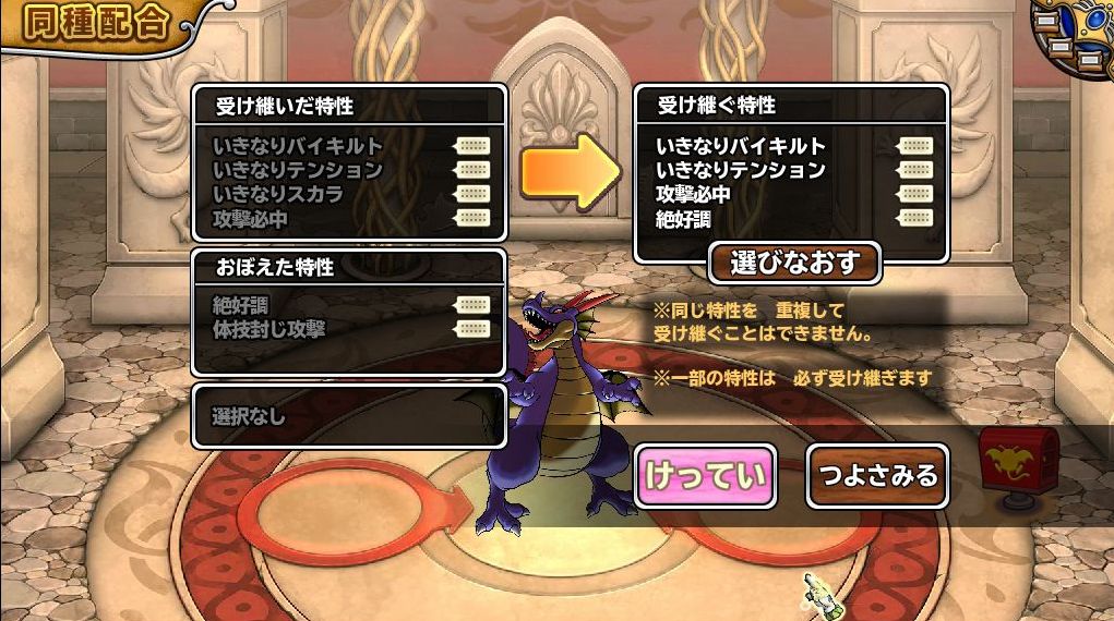 クリア報酬でもらった闇の覇者・竜王が、今回のメタルイベントでほぼ完成。こんなに良特性が揃った個体は初めてです。かいしん上げ作業がつらい^_^;