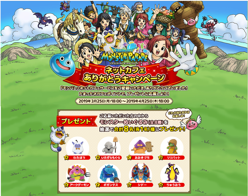 別の方も書き込みされてましたが、ネカフェのプレイサーヴィスが本日、18時を以って終了になります。利用時間が3時間で抽選に応募出来ます。当選すればリアル・モンパレが出来るかもしれませんので、本日お時間の取れる方はぜひ~♪