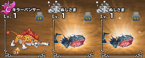 永遠の巨流と特技移植用にぬしさまが欲しくて3個投げ×4回、10個投げ×2回。ぬしさまは来てくれましたがまさかの2体。あと個人的に大ハズレのピサロが2体。巨竜が来なかったのは残念無念。欲しかったの片方が来たのでまあ良かった…かな (^^;