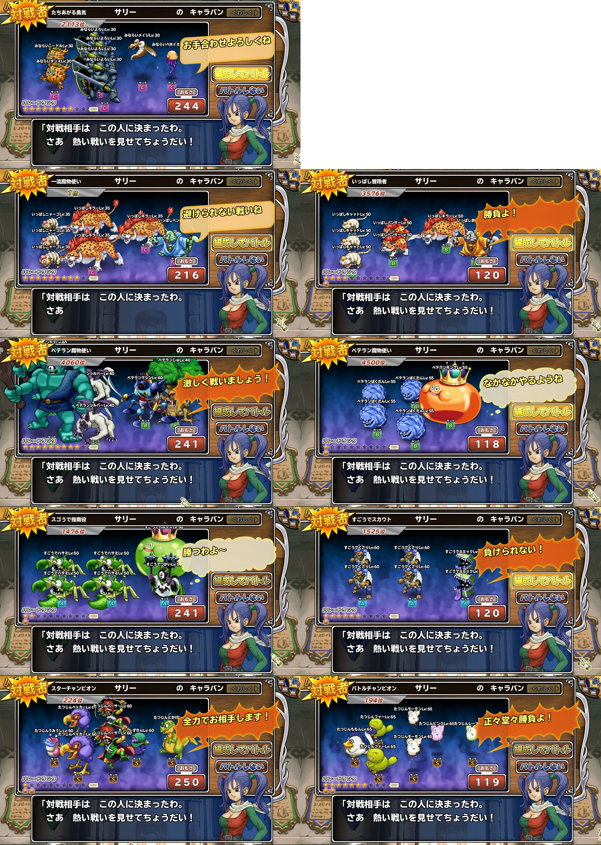 BSのサリーのスタメンを確認して画像を収めてきたのですが、ライト級のみならいクラスだけが埋まっていません。自分は今週ベテランクラスにいるため、再来週にはみならいクラスまで降りられるのですが、来週はまだ自分で確認に臨むことも出来ない状況です。来週のBSで確認に臨める方が居ましたら、どなたか協力して頂けないでしょうか。明日のメンテ明け直後に即行でBSへ行き、初戦に望めばサリーとマッチングできる可能性があります。よろしくお願いします。