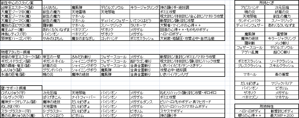 昨日、雑談版で昼頃に質問板で異界の相談をと言っていたものです。現時点での所持モンスター・とくぎなどはこんな感じです。プレイ歴は長く課