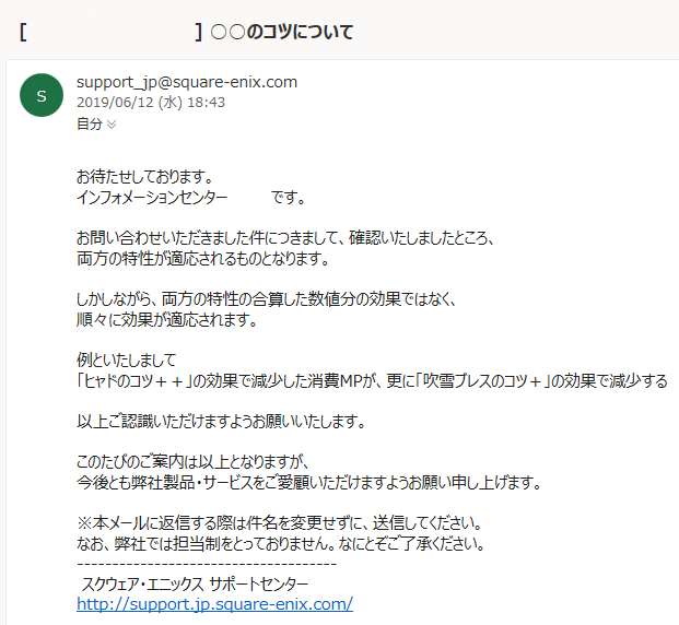 『「ヒャドのコツ++」と「吹雪ブレスのコツ+」を所持したモンスターが、「スノーマジック」を使用した際の消費MPについて』という問い合わせに対する、運営からの回答。両方の効果が適用されるけど、30%オフにはならないみたいね。