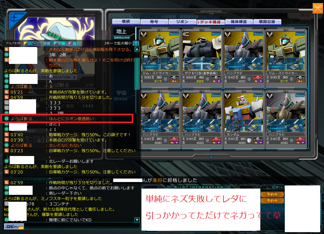 こいつ久しぶりに見かけたけど・・相変わらずだなぁーネズしてレダに引っかかって倒されてこの発言は草。ちなみにサイド7戦での出来事