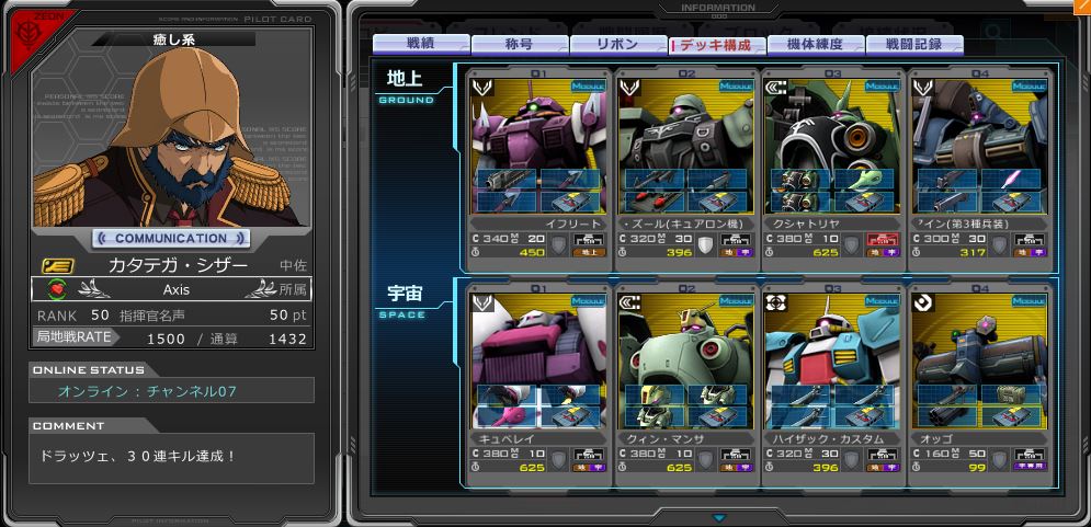 「ptが39になっちまったて連邦腹立つから後ろから撃墜したい」とか言って混合戦をネガってたけど・・・君のデッキで言われてたらジオンのワイでも腹立つからやめろ。ってか支援のオッゴ君も使ってないの君?と思いました。(宇宙の事です。