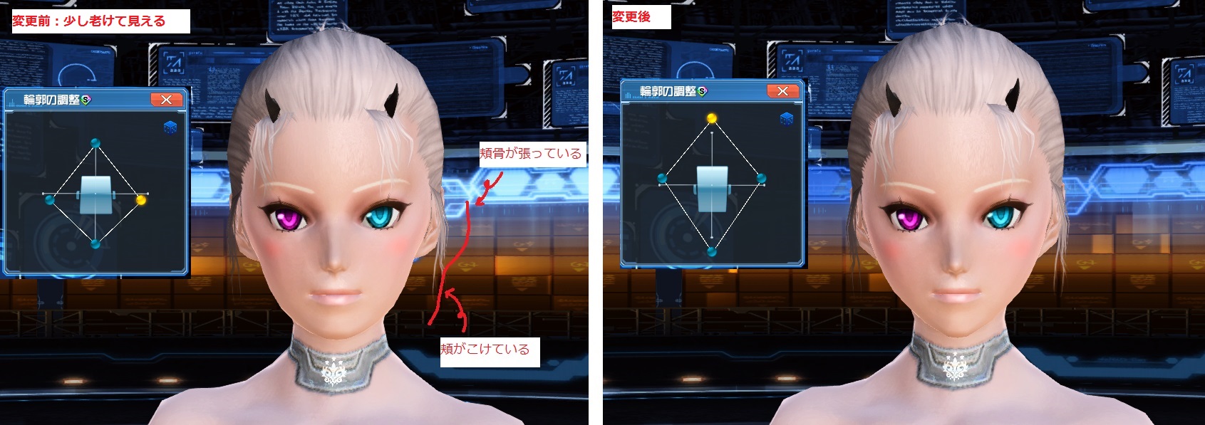 好み次第ですがイメージはそうです。狙う年齢によりますが、頬が張って、頬がやせていると老けやすいです。実際に輪郭ゲージをいじってみると、横軸が下側にあると今のような形になりやすいようなので、上側にもってきて調整すると良さげでした。イメージ図を貼りますので、参考になれば…。長文失礼。