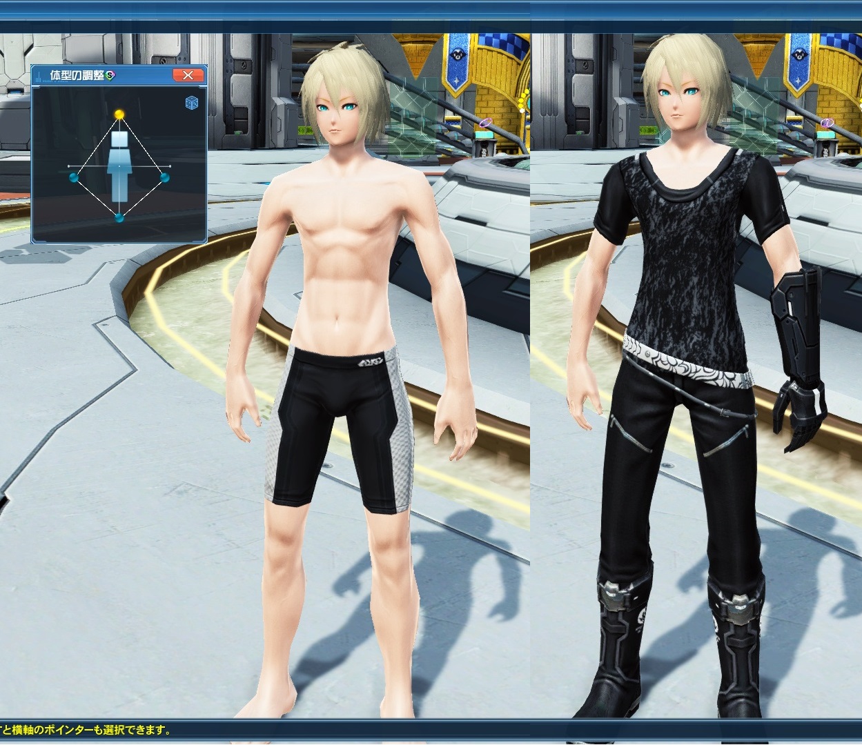 &color(Silver){へ、変態だ・・・!!};あ、こちらエステの画像になります。自分の場合普段遣いのコスがフロワガロウズ[Ba](右)なので、ソレ基準での調整になります。このBaなら特に問題はないのですが、膝位置を少し上げているので他の一部のコスでふくらはぎ周りが不自然に太くなったりする場合もあり、やはり着れないコスがどうしても出てきます。コス毎に調整が要るというのはどの人種、性別でも共通ですが、男性キャラは意外とそれが顕著です。ある程度の妥協点を見つけて調整するのがいいかと。--子木主