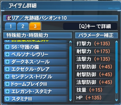 ☆13光跡纏パシオン+10を8Sにして、ペルソナ・レヴリー/ダークネス・ソール/エクゼクル・グレア/センテンス・トリプル/ドゥームブレイクⅢ/エレガント・スタミナ/スタミナⅢ。これで打射法各135、防御各45、技量15、HP135、PP10になるはずが、射撃だけ175になってる。なんでこうなるんだ?いや数値が上がる分にはいいんだけど理由がわからん。