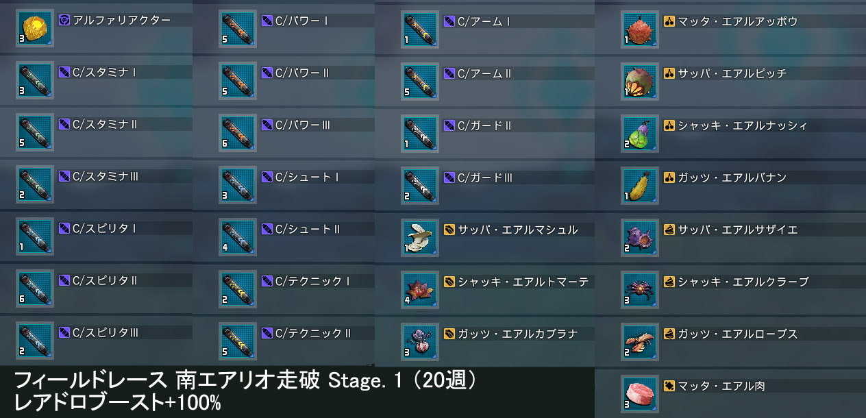 南エアリオ走破Stage1(20週)をレアドロ+100%でやってみた結果です。カプセルドロップが1、2個になることがあったのでクリア時間なのか、夜は出にくいとか思ってみたりして、その後も周回しましたがわかりませんでした。ランダムなのかなぁ。