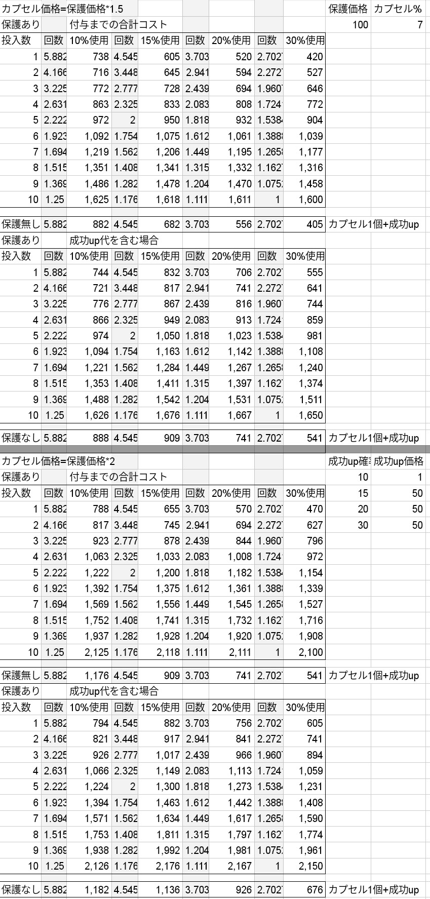 使った計算式は、回数=100/成功確率、保護あり成功up代なし=カプセル単価*投入数+保護価格*回数、保護なし成功up代なし=カプセル価格*回数です。成功up代ありはこれらに成功up代*回数を加算しています。