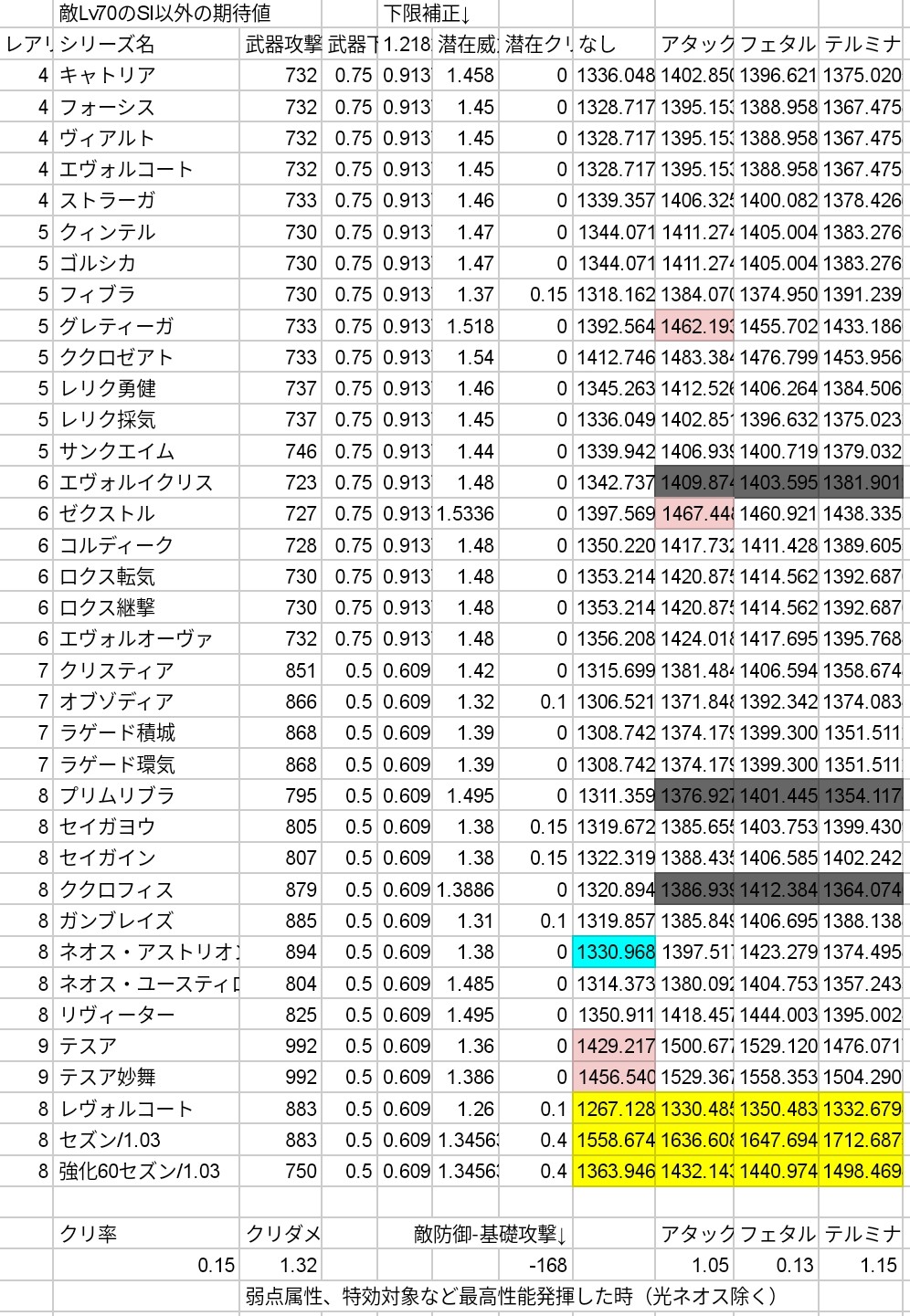 セズンのクリティカル率が30%で計算してましたが25%でした。セズンあり70のプリセットなしは1524、アタック5は1600、フェタル5は1613、テルミナ5は1664です。