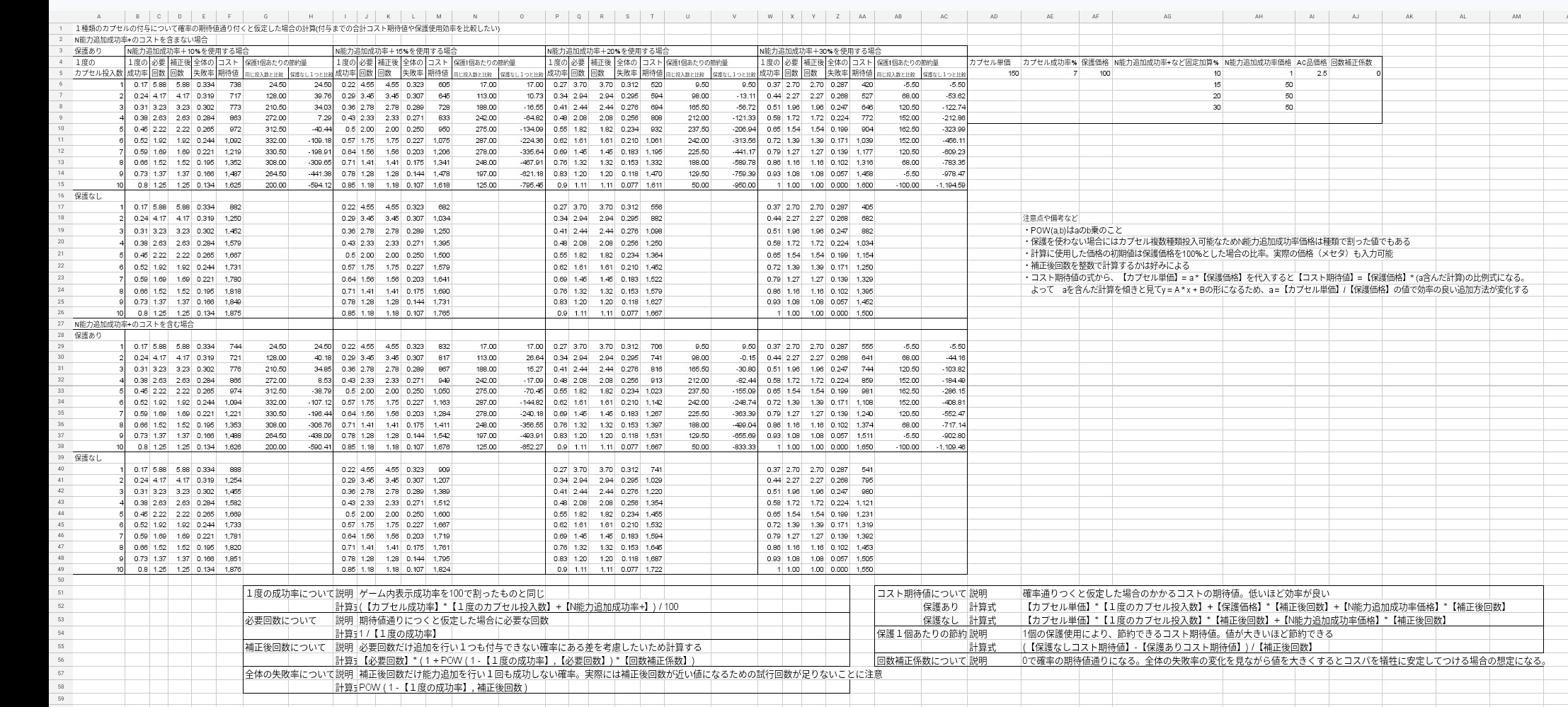 指定失敗率は全体の失敗率を入力できるようにした値。失敗率から補正後回数を求めて失敗率が同じ場合で比較する。【補正後回数】= LOG (【指定失敗率】, 1 -【1度の成功率】)