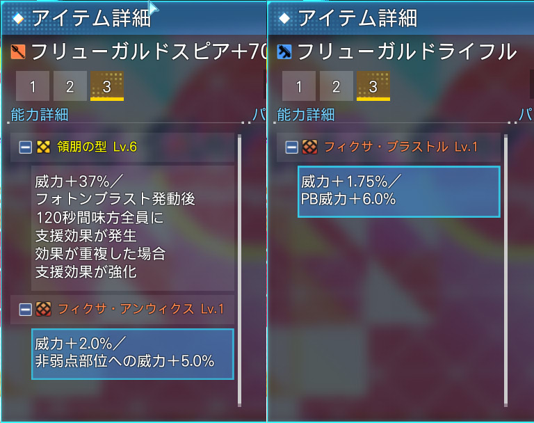 ■フィクサ・ブラストル Lv.1 (効果:威力+1.75%/PB威力+6.0%)■フィクサ・アンウィクス Lv.1 (効果:威力+2.0%/非弱点部位への威力+5.0%)マイショにて確認