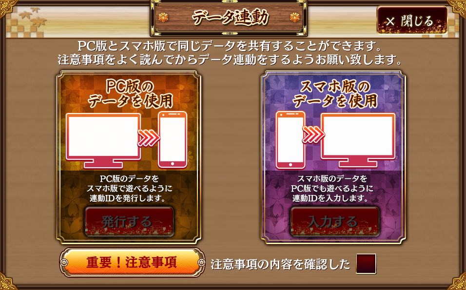 pcから連動させる場合はパソコン上から必ず左の「PC版のデータを使用」を押すこと。ID/パスワードで間違いやすいのが「l(エル)」「I(アイ)」数字の「1」。ウチは数回間違えました。また連動したらPC版も厚着をするという噂があるらしいですが、ガセです。