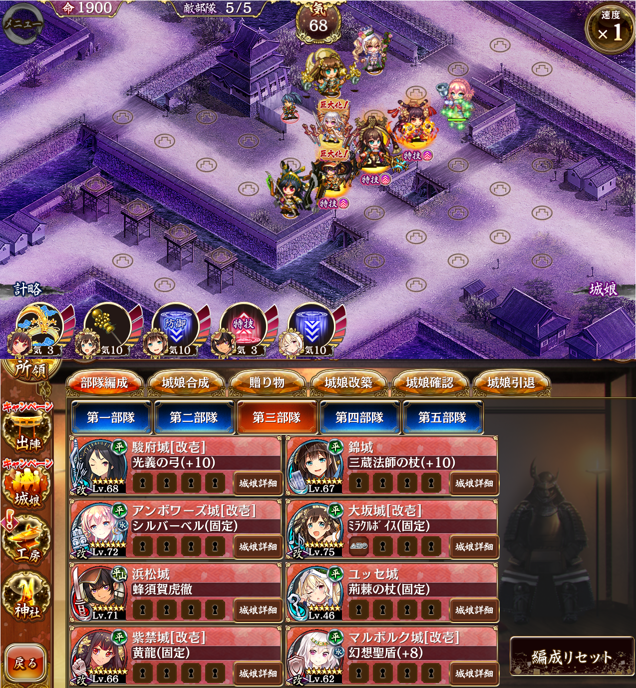 なんとか難クリア。光義持った弓を8において、大阪バフ+黄龍バフを加えると相撲3体に届いたおかげでだいぶ楽になった。光成は拳前でいつものタイムボム。ユッセがボスキラーすぎる。