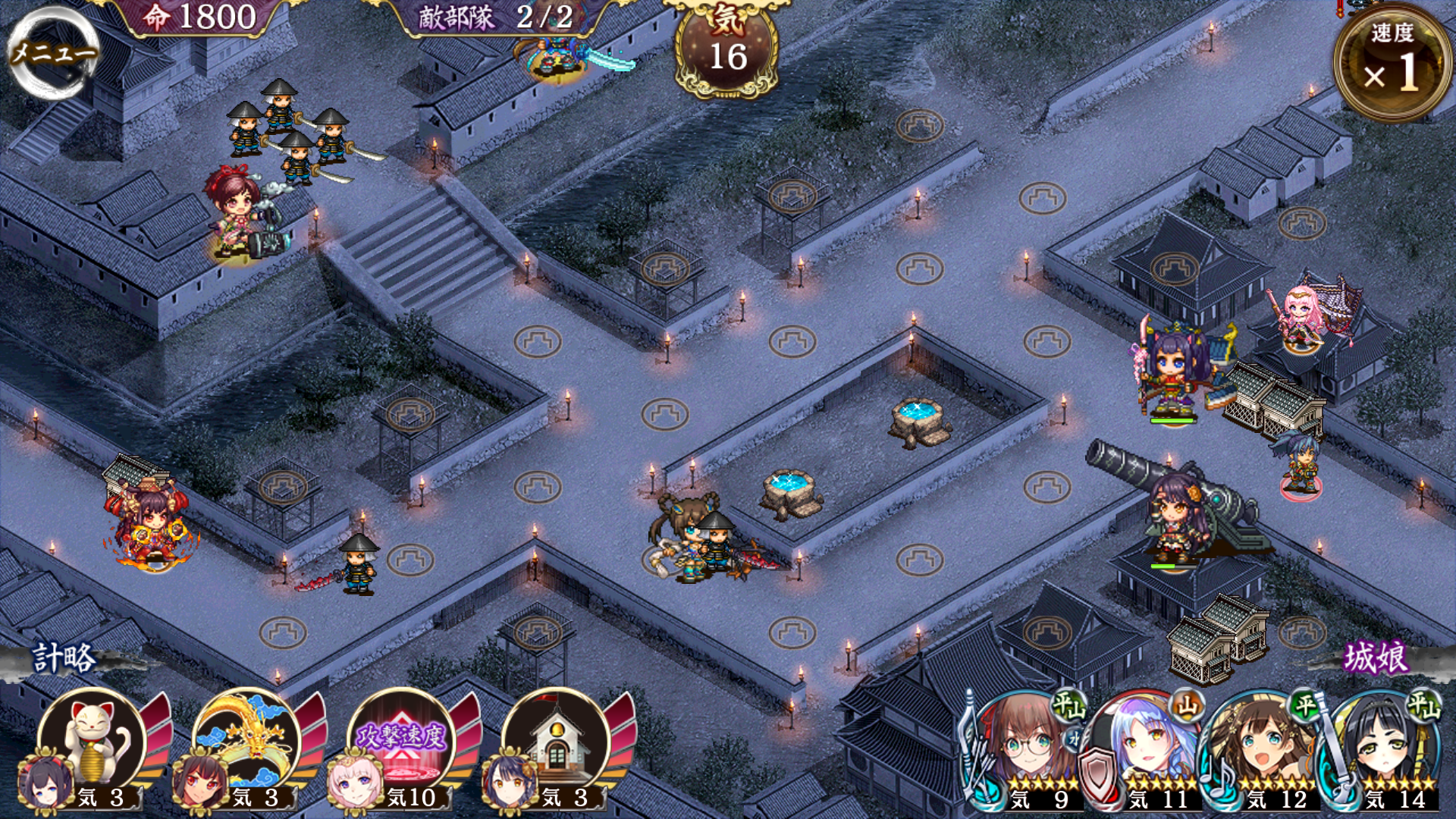 難再配置無しできた。1waveは彦根改(94桜花)と臼杵改(68カノン)二人の最大化凹み受けで全滅できた。2wave前にA蔵に紫禁改(70)滝山が臼杵範囲内頃に姫路計略。槌と槍の娘ガードに歌舞21、盾17配置でほぼ最大化。臼杵に姫路連発、小田原にデコイ全部投げてギリ耐えた。篠山、福知山は出番無し。青マス攻撃されるから1waveしか気稼ぎできなかったよ。