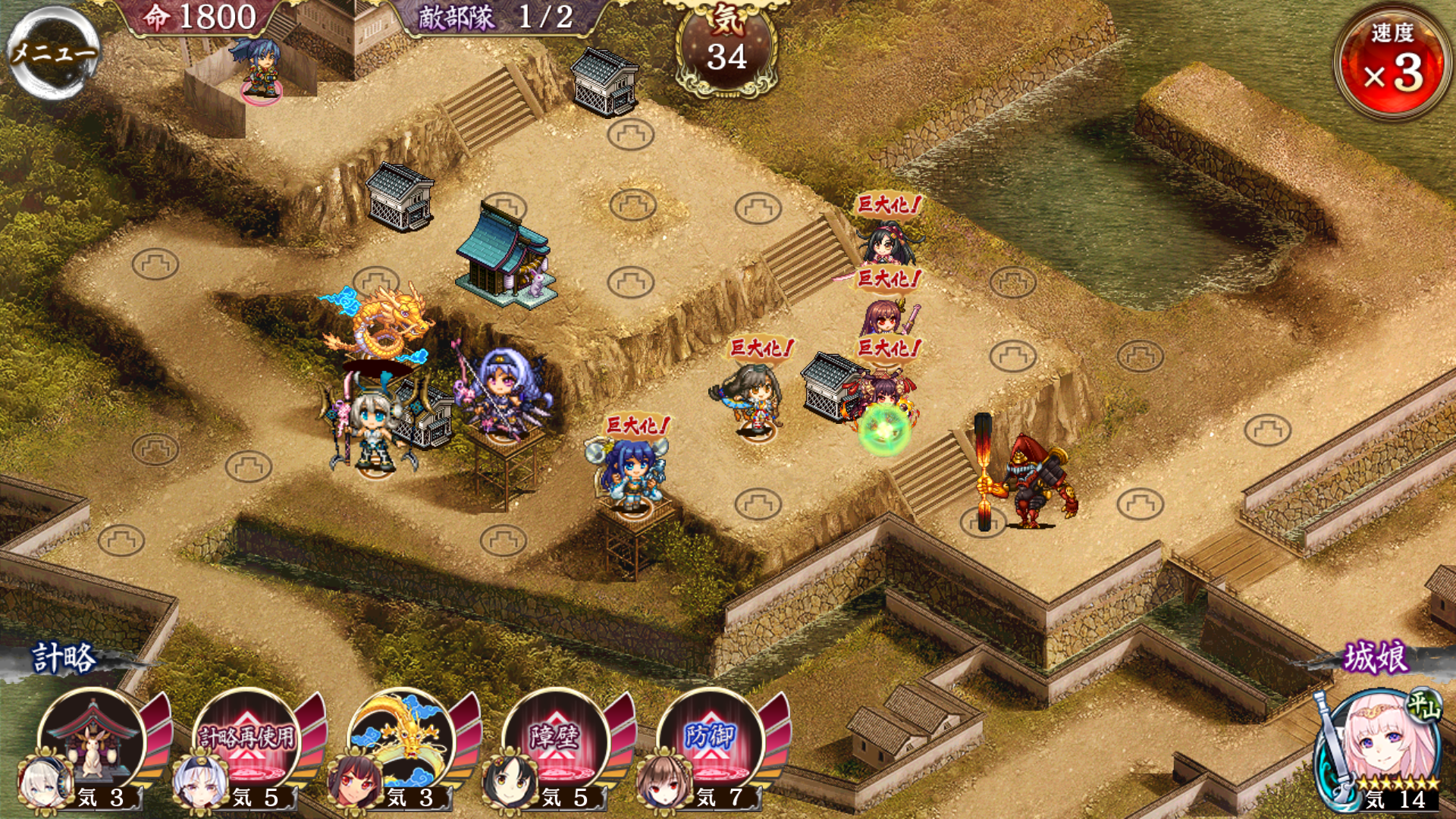 高Lv鉄砲狭間範囲モリモリだけど編成を変えて戦力抑えぎみの全蔵再配置無しで。一波終了前。配置順鹿野→柳生→萩→紫禁→気×2後鹿野最大化。高岡配置最大化→山科配置巨大化3鶴ケ岡配置巨大化2で波終了時。