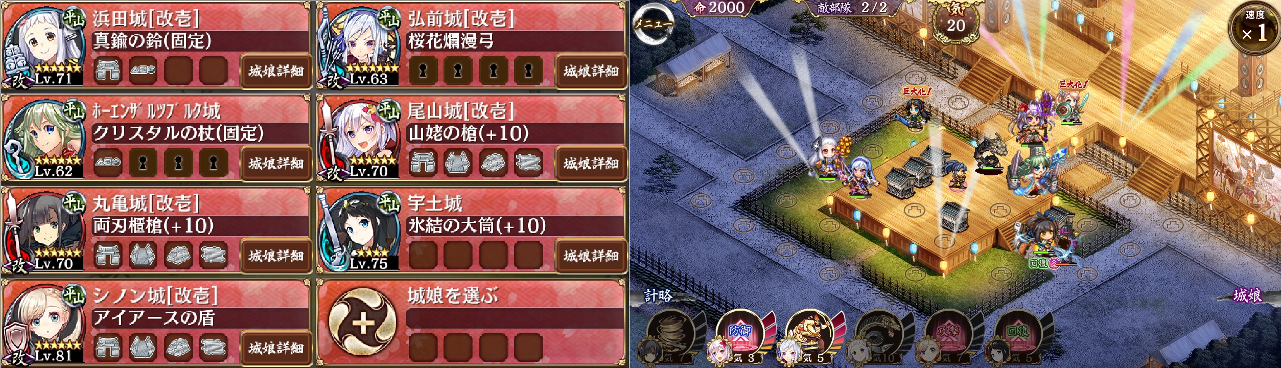 開始後、鈴(すぐに巨大化1回)→弓→杖→尾山→丸亀の順に配置。それから杖4回→鈴1回→丸亀1回→弓最大までそれぞれ巨大化をして第一波終了。