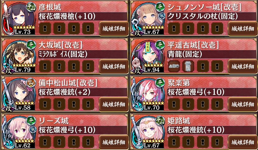 23槍(彦根) 26遠距離気トークン持ち(備中松山城改) 17歌舞(大坂改) 10拳(平遥古改) 11銃(姫路) 22杖(シュノンソー改) 15弓(リーズ) 32弓(聚楽第) で委任解放 32の弓が2回佐竹式に殴られるので巨大化残しておくのと要育成 彦根が結構ヤバいときが多いので27に刀狩り置いたり備中松山のトークンでタゲそらして保護 ラッシュは姫路計略で凌ぐ 左にシュノンソーのトークン置いとくと相撲が楽 信長は24くらいまで来たら姫路に自身の計略使って足止めしつつみんなでタコ殴り 途中赤法術にD倉落とされないようにだけ注意 気をつけたのはこれくらい