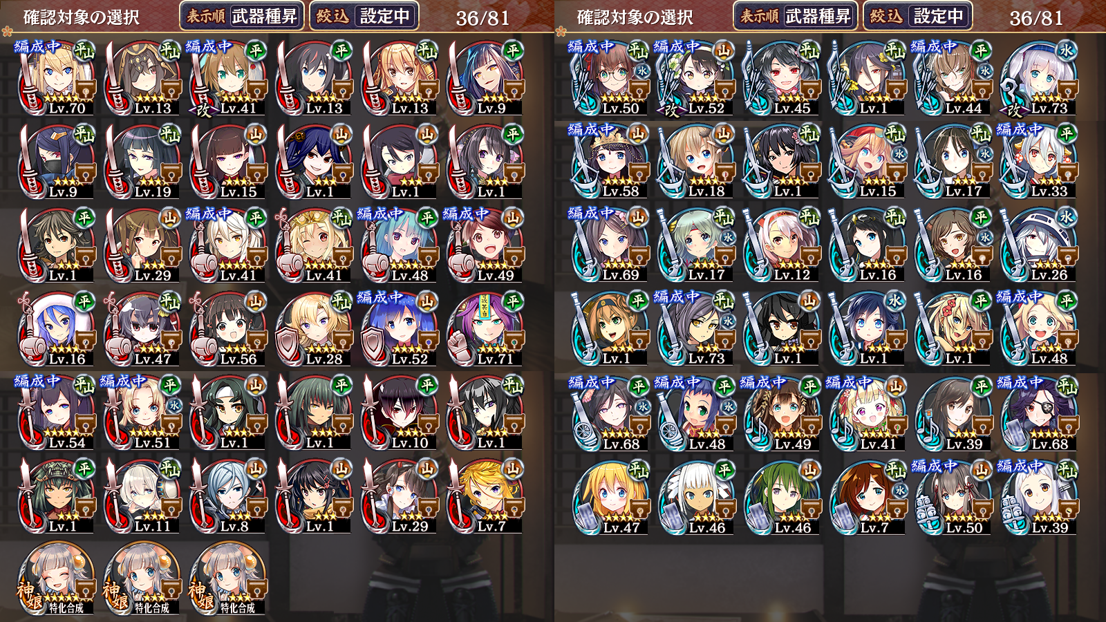 一週間前にここで手持ちを晒してアドバイスを頂いた者です。御陰様で、天一を普40難35まで進め、緊急絶一難をクリアできる程度まで進歩しました。今回は、前回の御礼の為と、初心者ログインを終えたので、育成報告を兼ねてもう一度手持ちを晒すことにしました。また、改築周りの優先度や、現状無課金の場合ステップup招城の二回目は回すべきか否か等、御教示頂けると幸いです。