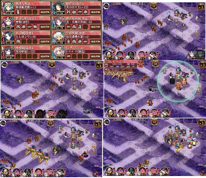 週末本気殿の参考になれば。(右上)駿府を3強化して騎馬を倒し、彦根・上田を最大化。注意点は備中高松を最初に置いて被弾を減らす配慮を。(中左)モサミを巨大化させつつ、近接の耐久に気を付ける。(中右)左側から来る牛鬼がモサミの射程内くらいで徳川大坂の計略、多分倒し切れないので計略連打。(左下)駿府を移動して毛虫に対応。駿府、徳川大坂を最大化すれば3匹届き、対処したら移動。山県は徳川大坂計略を掛け、平遥古と上田の間に鉄狛・牛でデコイで凌ぐ。(右下)山県を倒したら平遥古・ババ様を移動で勝利です。