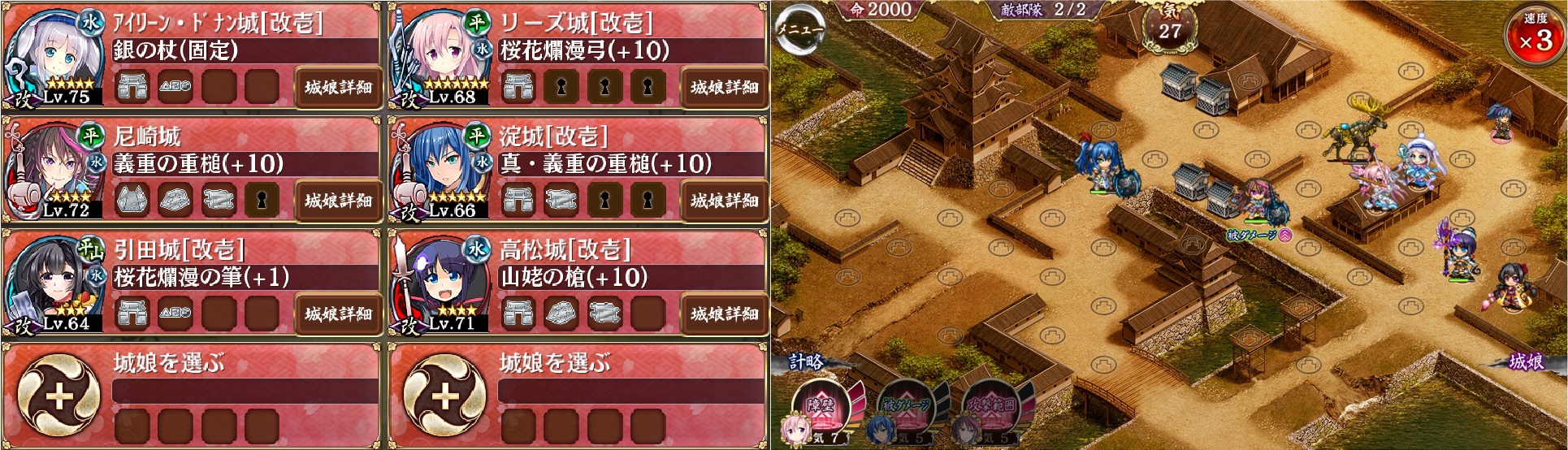 その後、敵岩手山城が上陸した時に淀計略を槍に使用→左上に出てくる最後の黒母衣兜2体が見えたら杖の特技発動→敵小牧山城が天守から地面へ着地した時に尼崎計略を淀に使用。
