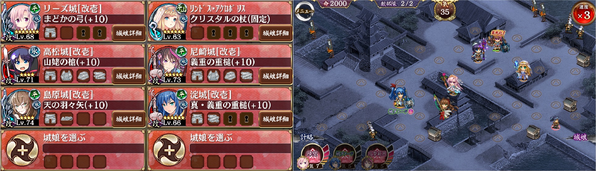 もし最後にやって来る左側の象がA蔵を壊す前に倒しきれない場合は城娘の火力が足りていないので、装備やレベルを強化しておくこと。