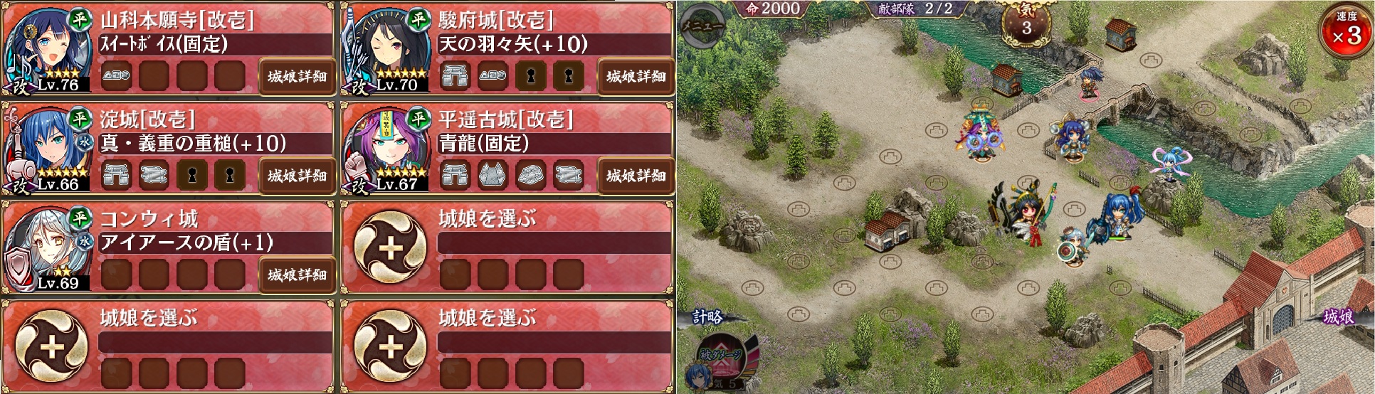 大槌の特技が発動したら、拳を設置して特技を発動。それからすぐに歌舞を3回巨大化。能力的にギリギリなので気が溜まり次第この流れを速やかに行わないと、槍の僧兵が殿を傷つけたり、敵の鬼ヶ城がC蔵を傷つける。