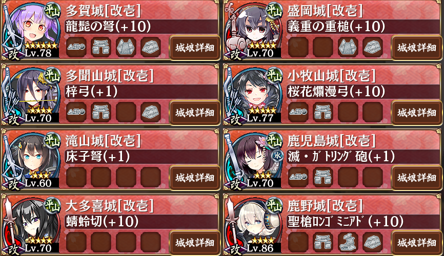 かなり昔の話なのでうろ覚えですが、自分が岩代難クリアした時の編成です。武器と設備は乗せっぱなしなので忘れて下さい。平均レベル-30ぐらいだったかと思います。枝で挙げたキャラでやりくりして行けるかと思います。