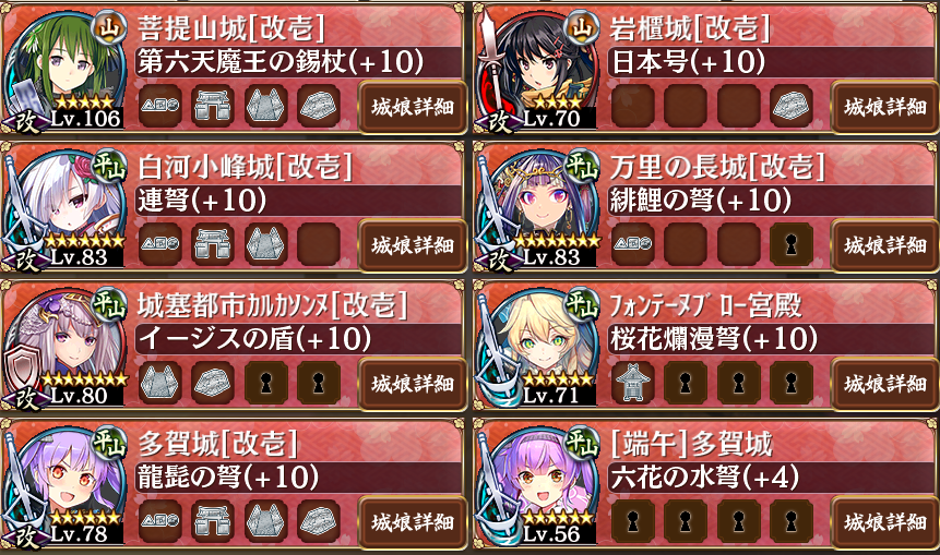 この間のコンセプト編成はウチでも相当チョイス悩みながらやったらこうなったな。1、2番と7、8番は確定してたけど これで戦えるのかとかはしらん