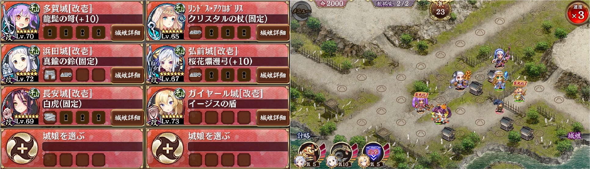 開始後、編成順に城娘をすべて設置して、弓→拳の順に特技発動。ここまでで第一波終了。順番を間違えると敵紅蓮から思わぬダメージを喰らうので、特に遠距離城娘の配置は間違えないこと。