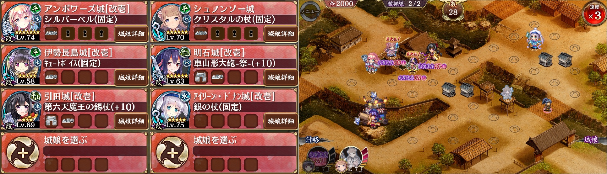 開始したら編成順に大砲まで設置したら、すぐに鈴を1回巨大化→敵の矢を受けたシュノンソーの耐久が半分を切ったら1回巨大化→鈴を2回巨大化→上からやって来る大貝型兜と犬型兜が現れる頃に残りの城娘を設置。札とアイリーン・ドナンは早く置かないと兜によって蔵が傷つくので忘れずに。