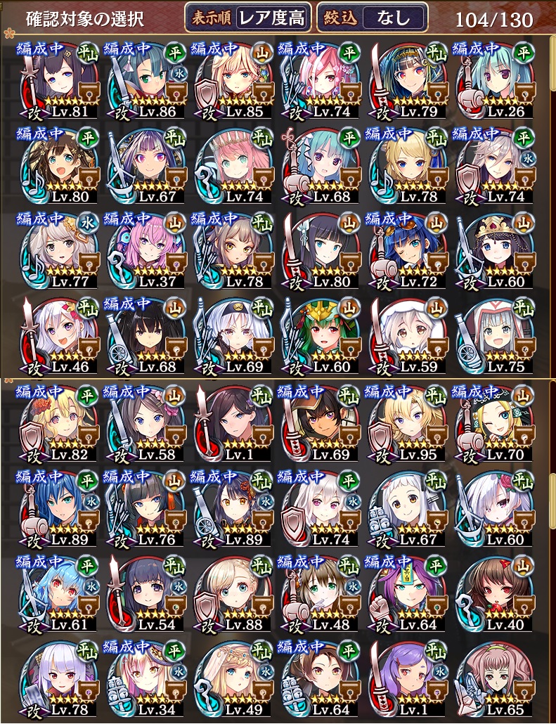 手持ちがこんな感じで、水弓は育ってないどころかむしろ限りなくいないんだけど、普通に考えたら拳か札を取れってって感じなのが…。正直現状戦力足りなくはないと思うから、そこまで効率気にしなくてもいいっちゃいいとも思うのだけど悩ましくて…orz