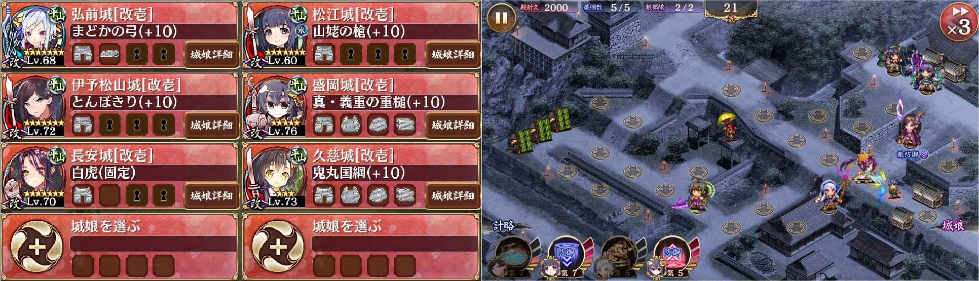刀に松江計略を使用するのは、火力が足りずに敵の苗木城1体を討ち漏らしてA、C蔵や殿が傷つくからである。弓も含めあと少し火力があれば計略は必要ないが確実ではないので使用した方が賢明だと思われる。