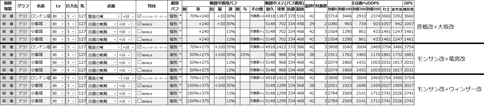 現実的な範囲でバフ乗せて(地形補正は抜き)同じく最強クラスと言われるロンドンと比較。彦根大坂だと分身2でロンドン並み。モンサン竜宮の水パだと分身1でロンドンと互角。ウィンザーさえいれば分身1でロンドンを超える。実際は地形補正もかかるので、このバフ構成だと平ではロンドンに遠く及ばないし平山と水ならロンドンを軽く超える。ただし自分に計略投げるだけのロンドンより気の消費はかなり増える。