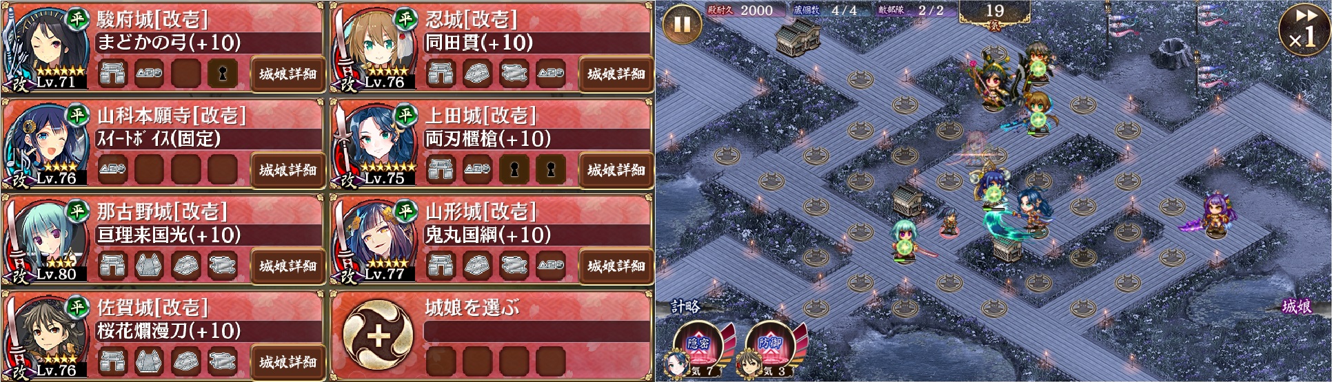 開始したら編成順に忍まで置いて、弓の特技発動→忍を2回巨大化→残りの城娘を編成順に那古屋まで設置→那古屋の特技発動→歌舞を1回巨大化。ここまでで第一波が終了。