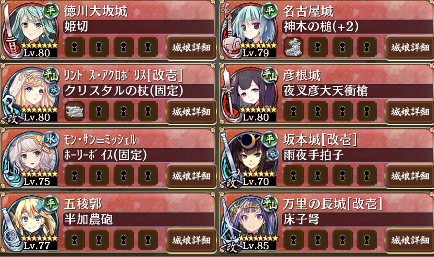 徳川大阪(12)、名古屋(19)、彦根(45→第3波から22)、モンさん(21)、坂本(15)、五稜郭(41)、万里(40→チェーン2体倒し次第27)でやっているのですがなかなか勝てません。特に第3波の彦根城を移動させてからのDの蔵周辺(五稜郭だけでは盾持ちの兜を倒しきれない)や黒い相撲取りのような兜の固さに負けてしまいます。運良く最後の織田信長まで辿り着いても城娘を一人一人順番に倒されていくというような始末で… 編成などでアドバイスがありましたら、教えて頂きたいです。お願い致します。