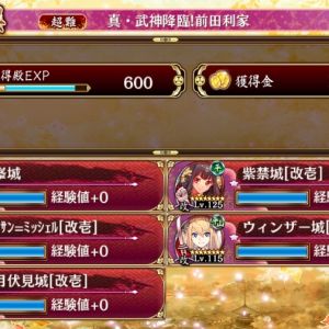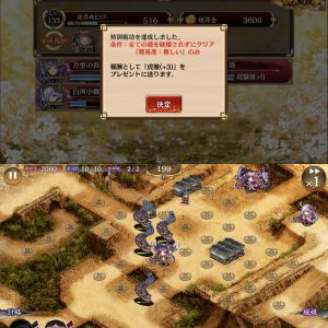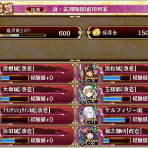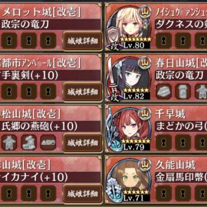 戦功1、2同時クリア構成。21浜松→17柳→20紫禁→27大阪→28彦根→13姫路でスタート。途中で適当に37菩提と15ヴァルトを足す。この状態で利家が来るまで適当に戦う。利家が来たらヴァルトを引っ込めて11に再配置、柳も利家を射ってしまうので引っ込め利家が怒ったら25に再配置。あとはトークンで時間稼ぎをしながら姫路と柳で利家を射殺す。高レア&高レベルの暴力ですがご参考になれば・・・。山統一は新田、久能、千早から2名は居ないと無理だと思ったのでパスしました。